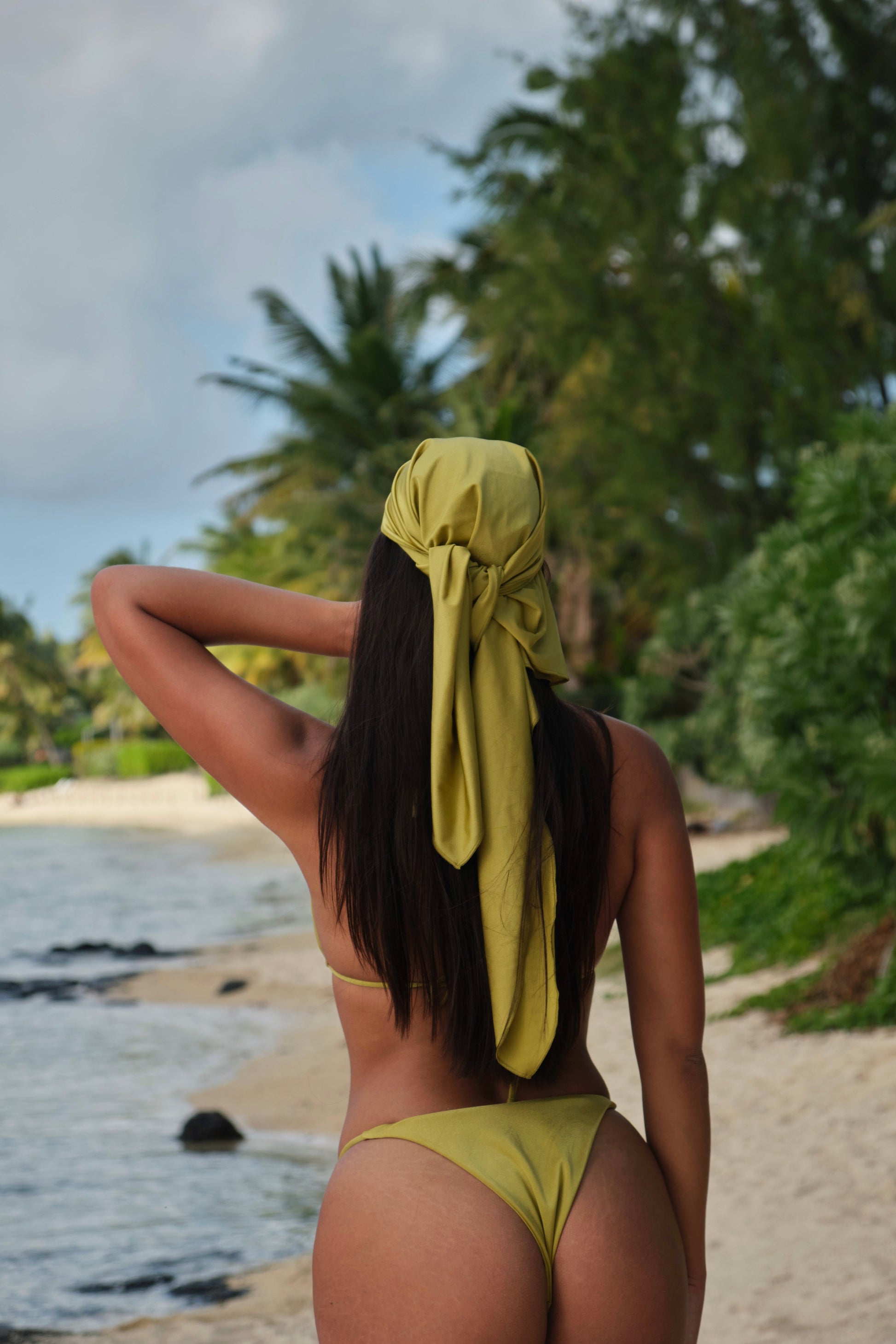 Un maillot de bain triangle accompagné d’un paréo polyvalent, à nouer autour de la taille pour un look subtil ou autour de la tête pour une allure plus audacieuse.